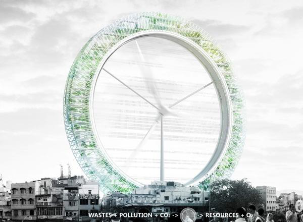 循環中心是一個大型的風力渦輪,像一個大肺一樣,轉動在新德里城市中心,能量及二氧化碳通過摩天輪里的植物、化學過濾器、微小顆粒的膜結構、高空溫室和礦化設備將氧氣釋放到城市上空。