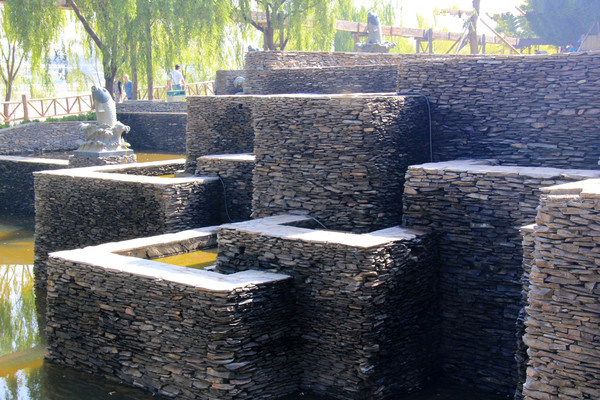 (8)不同水體形態(tài)之間以及水體和其他元素的結(jié)合使用可豐富環(huán)境的多樣性。設(shè)計(jì)中通常是多種形式的水體組合使用,如跌水和靜水的結(jié)合、噴泉和跌水的結(jié)合等;也要注意水體和植被、山石等元素結(jié)合起來設(shè)計(jì);還要考慮與水生動植物的結(jié)合,各種不同的動植物,如水中的荷蓮、水邊的蘆葦、各種魚類等,這樣既能體現(xiàn)生物的多樣性,也能增加空間的趣味性。