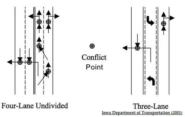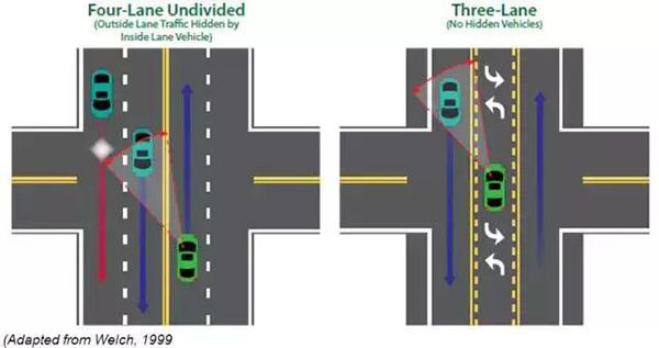 在美國,道路瘦身的形式是將傳統的雙向四車道改造為帶有中央左轉專用道的三車道道路,當然還可以通過三車道改造為兩車道、自行車道改造為隔離式(受保護)的自行車專用道、減少寬街道的車道寬度等方式進行「道路瘦身」工程。