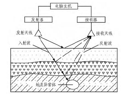 地質雷達是一種根據巖體介質的電性差異對巖體介質或地質異常體進行探測的電磁波探測技術[13]。通過地質雷達天線向巖體內部發射電磁波,電磁波在不同電性差異界面反射,反射回來的電磁波被接收天線接收,接收數據再傳至電腦進行處理,其探測原理如圖1 所示。通過對采集的數據進行處理,得到雷達反射圖像,對圖像進行分析,并結合現場實際情況,可以推測不良地質體的類型、位置及其分布特點[14]。