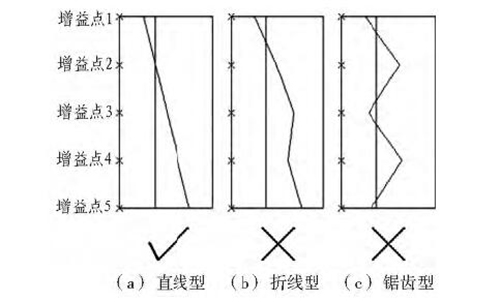 地質雷達探測時,電磁波由探測面向遠處傳播,部分能量會被介質吸收掉,反射波能量相應減少。距離天線越近反射波能量越大,距離天線越遠反射波能量越小,會在雷達圖像上反映出比較明顯的能量分層帶,越靠近探測表面信號越強,遠端信號較弱,因此,需要進行增益調節來放大有效信號。正確的增益調節方式如圖8( a) 所示。增益調節的原則是保證增益點之間線性變化,同時應使反射能量控制在一定的范圍。增益太大會造成削波現象,掩蓋有效信號,增益太小有效信號不明顯,異常體位置不突出[14]。應根據隧道的實際情況,將天線移至探測位置,采用先自動后手動的方法調節增益。