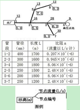 某城市采用枝狀管網(wǎng)供水,節(jié)點(diǎn)流量、地面標(biāo)高如圖所示,各管段長(zhǎng)度、管徑、比阻見(jiàn)下表,節(jié)點(diǎn)4處設(shè)一高位水池,最高日總用水量120L/s,其中20L/s由高位水池供給,要求管網(wǎng)最小服務(wù)水頭為20m。