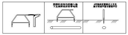 5、管線的對(duì)地泄漏電流可由“A”字架兩腳分別接收,而接收機(jī)顯示的信號(hào)大小則是兩針接收信號(hào)的差值,當(dāng)兩針接收的差值為零時(shí),則說明“A”字架在故障點(diǎn)的正上方