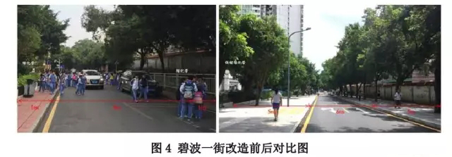 ● 碧波一街:原雙向車(chē)道機(jī)動(dòng)車(chē)道寬度從米壓縮為米,利用兩側(cè)消極的綠化帶,將兩側(cè)人行道寬度從米加寬到米。