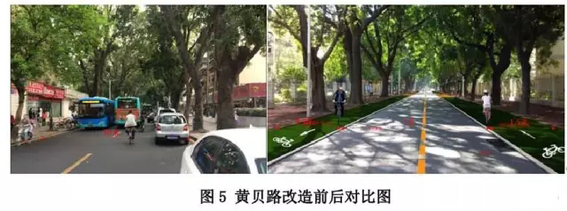 ● 黃貝路:原10 米機(jī)動(dòng)車(chē)道壓縮為米,在兩側(cè)各設(shè)置1.5 米寬自行車(chē)道,解決自行車(chē)出行和地鐵接駁需要。