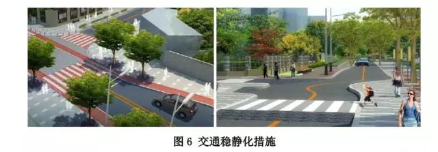 同時(shí),碧波片區(qū)內(nèi)道路均為社區(qū)級(jí)城市支路,原有道路條件(直線(xiàn))和限速(3040km/h)明顯不利于安寧社區(qū)的建設(shè)。我們通過(guò)通過(guò)設(shè)置一系列的交通穩(wěn)靜化措施,例如道路曲折化、人行過(guò)街抬高及交叉口轉(zhuǎn)彎半徑縮窄等,適當(dāng)降低降低碧波一街、德智路和黃貝路車(chē)速(2030km/h),從而改善行人交通安全。