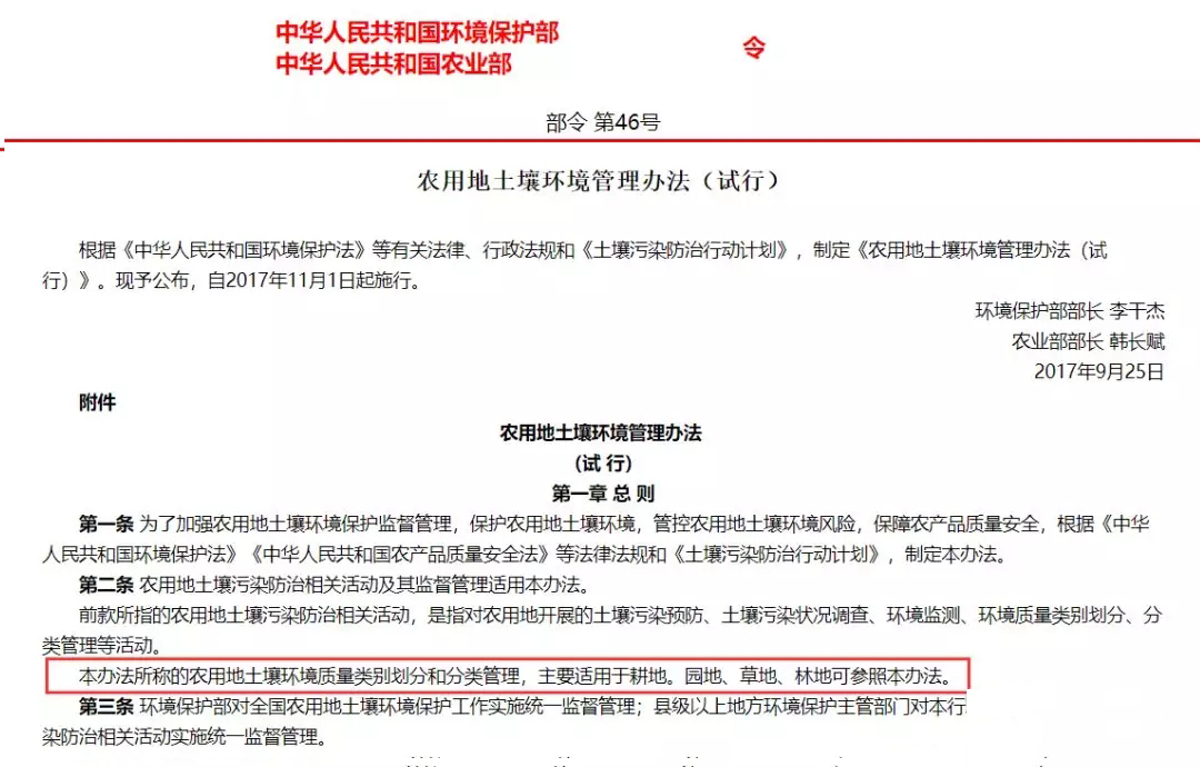 在該標(biāo)準(zhǔn)發(fā)布之前,環(huán)保部和農(nóng)業(yè)部于2017年9月25日聯(lián)合發(fā)布了《農(nóng)用地土壤環(huán)境管理辦法(試行)》(環(huán)境保護(hù)部、農(nóng)業(yè)部令 第46號(hào)),自2017年11月1日起施行。該辦法第二條第三款規(guī)定:“本辦法所稱的農(nóng)用地土壤環(huán)境質(zhì)量類別劃分和分類管理,主要適用于耕地。園地、草地、林地可參照本辦法。”同時(shí),該辦法第十二條第一款規(guī)定:“禁止在農(nóng)用地排放、傾倒、使用污泥、清淤底泥、尾礦(渣)等可能對(duì)土壤造成污染的固體廢物。"看到這里小伙伴們是不是有點(diǎn)蒙了,一個(gè)是強(qiáng)制性國(guó)家標(biāo)準(zhǔn),一個(gè)是部門規(guī)章,一個(gè)說只要滿足要求就可以用,另一個(gè)卻說禁止用。