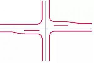 主要公路與次要公路的T形交叉,當轉彎交通量較大而會導致直行車輛的過分減速時,應采用加寬式T形交叉左轉彎交通量較大者,可采用該型式。