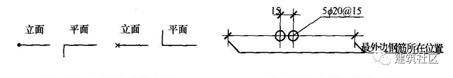 (9)在鋼筋構造圖中,當有指向閱圖者彎折的鋼筋時,應采用黑圓點表示;當有背向閱讀者彎折的鋼筋時,應采用“X”表示(圖2—55)