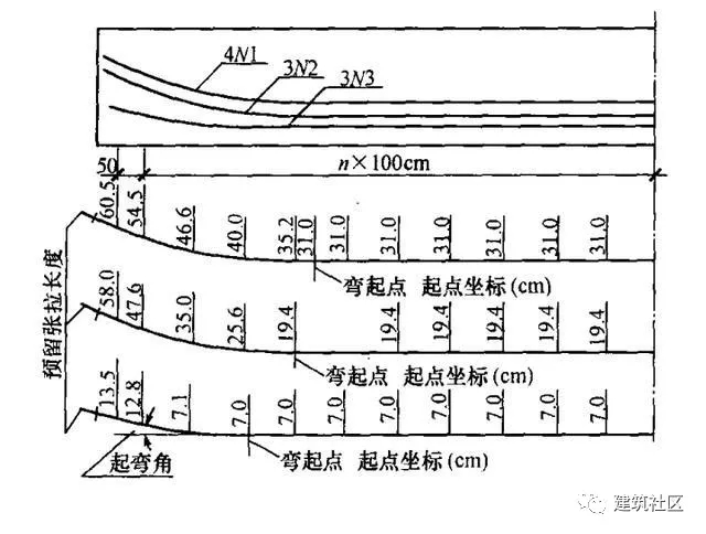 (5)對彎起的預應力鋼筋應列表或直接在預應力鋼筋大樣圖中,標出彎起角度、彎曲半徑切點的坐標(包括縱彎或既縱彎又平彎的鋼筋)及預留的張拉長度(圖2-47)。