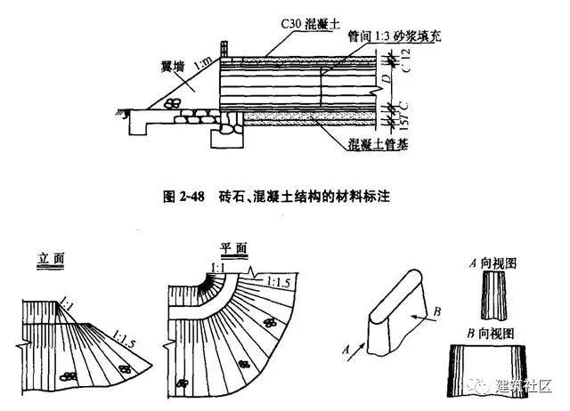 (1)磚石、混凝土結構圖中的材料標注,可在圖形中適當位置,用圖例表示(圖2-48)。當材料圖例不便繪制時,可采用引出線標注材料名稱及配合比。