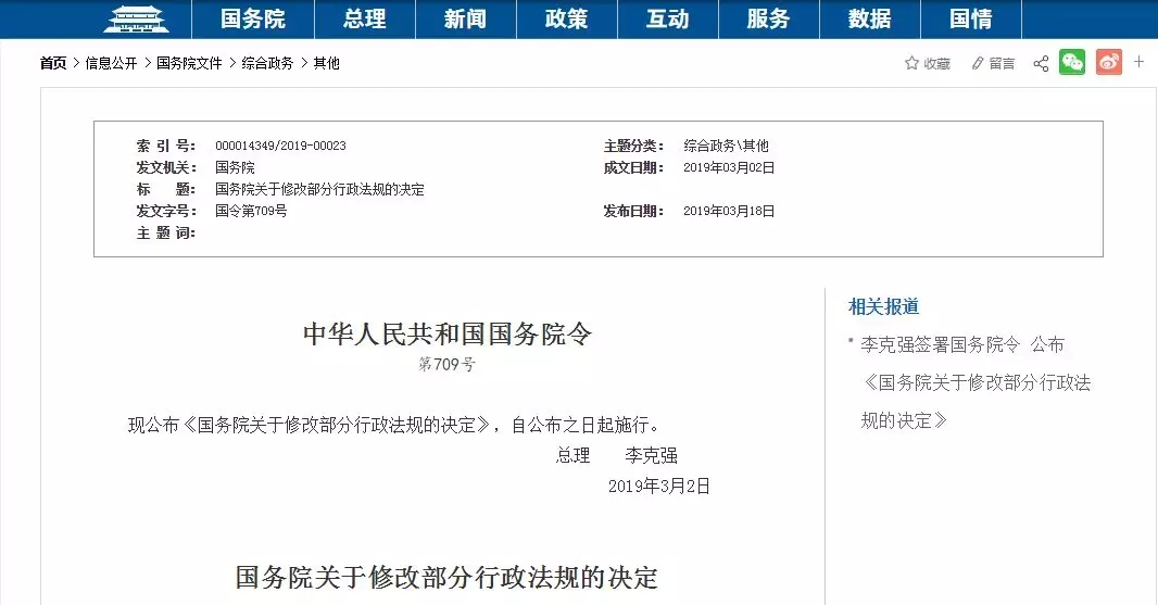 2019年3月18日,中國國務院總理李克強簽署國務院令,公布《國務院關于修改部分行政法規(guī)的決定》(以下簡稱《決定》),自公布之日起施行。