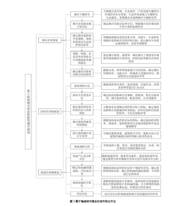海綿城市建設是一個復雜的系統,其建設應從城市 規劃的源頭著手,將海綿城市理念融入到城市各層級規 劃中,涉及到規劃、園林、水利、市政、道路等多部門、多專業之間的相互協調運作。海綿城市理念下的新型城市規劃方法對設計人員的要求已遠遠超過了傳統城市規劃專業,主要體現在它需要多規合一,即強調不同專業和部門的協調運作;區域規劃,即強調城鄉統籌和流域綜合治理;新型城市化,即強調以人為本的工作思路;生態文明,即強調綠色理念、科學技術和路徑。與營造城市空間的傳統規劃不同,海綿城市規劃關注的是城市與生態環境尤其與水的關系,這就需要打破城市規劃、園林、道路、市政等專業的被動配合與有限交互局面,解決不同專業技術協調性的困頓。基于海綿城市理念的城市規劃方法見圖 3。