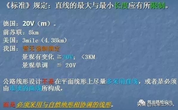 公路線形應(yīng)與地形相適應(yīng),與景觀相協(xié)調(diào),直線的最大長度應(yīng)有所限制,當(dāng)采用長的直線線形時,為彌補景觀單調(diào)的缺陷,應(yīng)結(jié)合具體情況采取相應(yīng)的技術(shù)措施。
