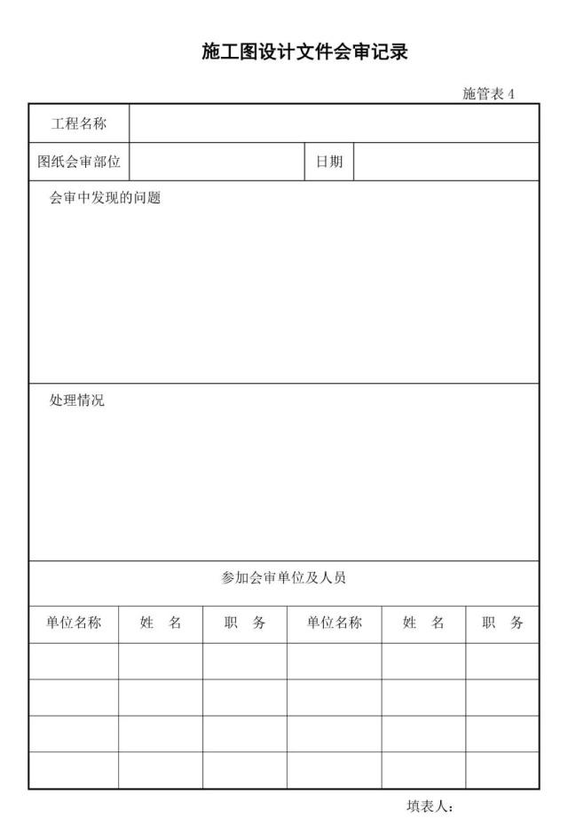 備 注:上表為城市(市政)道路工程國標使用表格,各地表格存在差異,優先選用各地方要求的相應表格,其次考慮使用國標表格,再次為了方便圖紙會審分類管理,也可參考使用下表。圖紙會審記錄需各單位項目負責人簽字,加蓋公章,作為施工圖紙的補充,后期為結算工程量提供依據。(以上僅供參考)