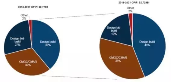 在美國工程建設市場上,主要存在三種工程建設模式:DBB 模式(DESIGN-BID-BUILD,類似于我國傳統工程建設模式)、CMGC/AR 模式(承包商介入工程設計階段,類似于分階段工程總承包模式)、DB 模式(DESIGN-BUILD,由一個承包商負責全部設計和施工,類似于全過程工程總承包模式)。根據美國設計建造學會和 FMI 咨詢公司的研究,2013 年到 2017 年期間,美國工程建設市場上 DB 模式占比最高,達 39%;2018 年到 2021 年的預測表明,DB 模式占比將進一步擴大,達到 44%。因此,在美國工程建設市場上,全過程工程總承包模式由于具備工期短、變更少、業主可控性高等優勢,成為最重要的工程建設模式。