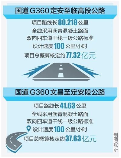 2019年8月,省發展改革委批復了國道G360定安至臨高段公路初步設計和概算。項目路線長80.218公里,全線采用瀝青混凝土路面,雙向四車道干線一級公路標準,設計速度100公里/小時。項目總概算核定約77.32億元。
