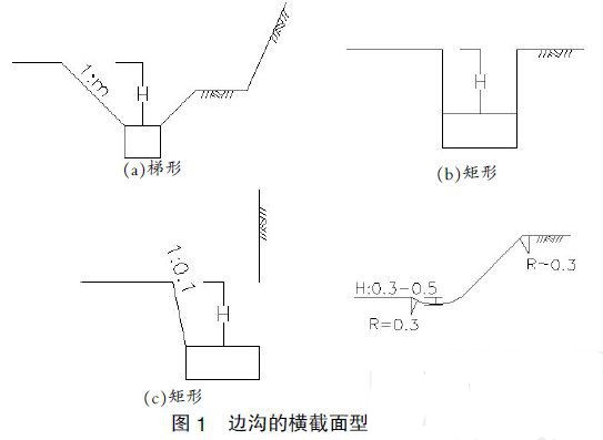 邊溝一般不需要進行水文和水力計算,可根據(jù)沿線情況,選用標(biāo)準(zhǔn)橫斷面形式.邊溝可采用三角形、流線形、梯形或矩形橫斷面(如下圖).底寬與深度都不應(yīng)小于0.4m;農(nóng)村公路受條件限制,需采用矩形斷面時,應(yīng)盡可能在頂面加帶槽孔的混凝土蓋板,以防止生活垃圾或雜物堵塞邊溝.當(dāng)采用梯形橫斷面時,邊溝內(nèi)側(cè)邊坡坡度按土質(zhì)類別采用1:1~1:1.5.