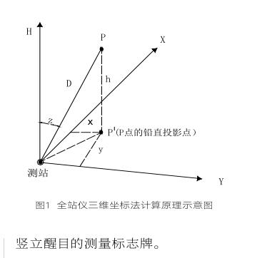 P點(diǎn)這個(gè)定位點(diǎn)的三維坐標(biāo)方程式是根據(jù)全站儀三維坐標(biāo)法測(cè)量原理而建立的,圖1為全站儀三維坐標(biāo)法計(jì)算原理。