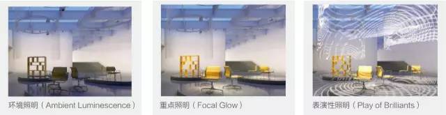 照明的三種基本功能分別是環境照明(Ambient Luminescence)、重點照明(Focal Glow)和表演性照明(Play of Brilliants)。