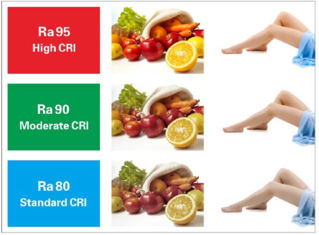 是指物體被光源發出的光照明時色彩被還原的真實程度。白熾燈的顯色指數為100,也就是說它對于色彩的還原性可以做到100%?,F在市面上對于LED光源的應用越來越普及,住宅照明產品光源的顯色指數都應該要大于80,優質LED光源的顯色指數能達到90以上甚至95,但是有一大部分的劣質產品其光源的顯色指數都不到70,所以用戶在選擇的時候一定要引起注意。下面關于顯色指數的對比圖可以有一個相對直觀的感受: