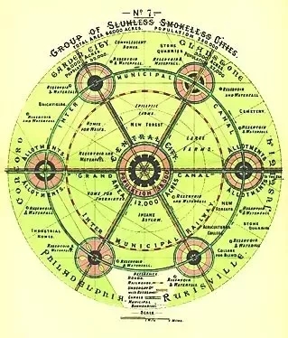 霍華德在世紀之交時(20世紀初)提出一個解決工業城市擁擠和嚴重污染的方法,他的解決方案的核心是在永久的綠化帶中創造一個集中在通過運河和交通工具連接起來的更小的“花園城市”(每個城市有3.2萬人)。