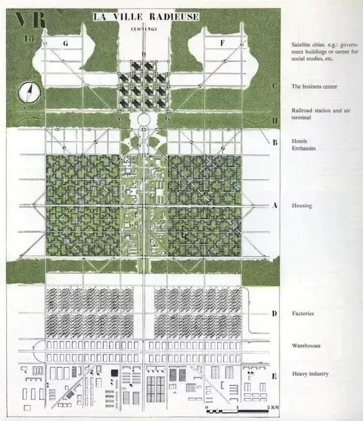 他的方案,也被稱為“公園中的塔”,名副其實:無數的高層建筑,每一個都被綠色空間包圍。每一棟建筑都被規劃師戲稱為“超級街區”,空間被清晰地劃分為不同的用途(在上圖中包括“住宅”、“商業中心”、“工廠”和“倉庫”)。