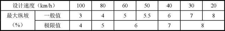 快速路的車速在60-100km/h,主干道的車速在40-60km/h;也就是說快速路的最大坡度在3-5%之間,主干道的最大坡度在5-6%之間。但是在實(shí)際的操作中,一般將主干道及快速路的坡度控制在3%以下,以上的數(shù)據(jù)可當(dāng)做極限值。