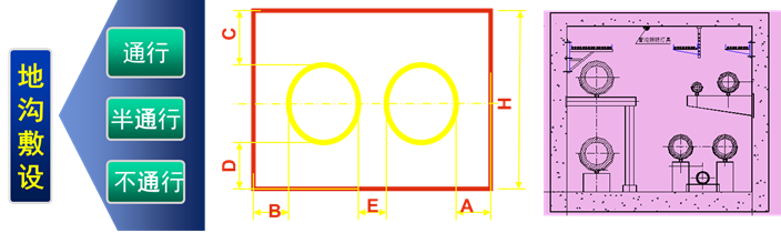 管溝敷設首選不通行管溝敷設;穿越不允許開挖檢修的地段時,采用通行管溝敷設;通行管溝困難時,采用半通行管溝敷設。