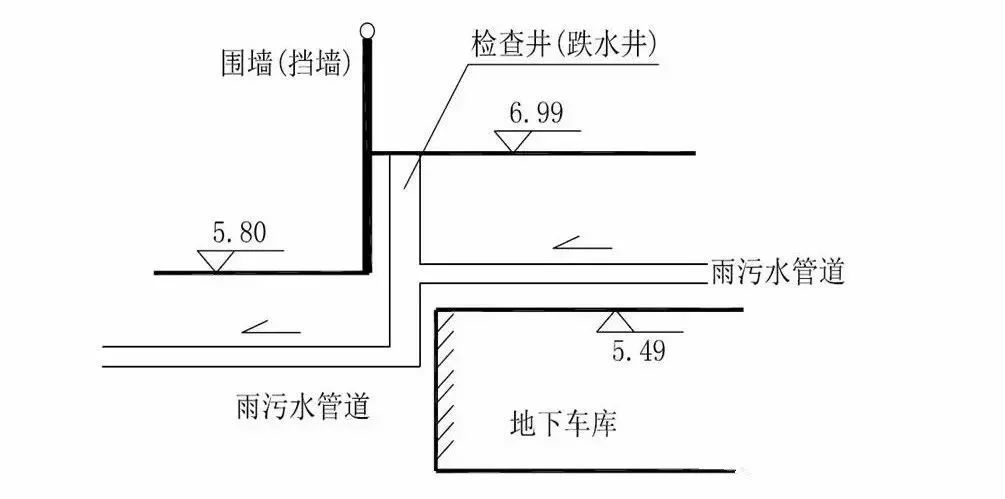針對項目地下管線需跨越地庫、小區環路、市政道路3個標高,小區雨污水管無法直接排入市政管網,設計上選用跌水井,如圖。