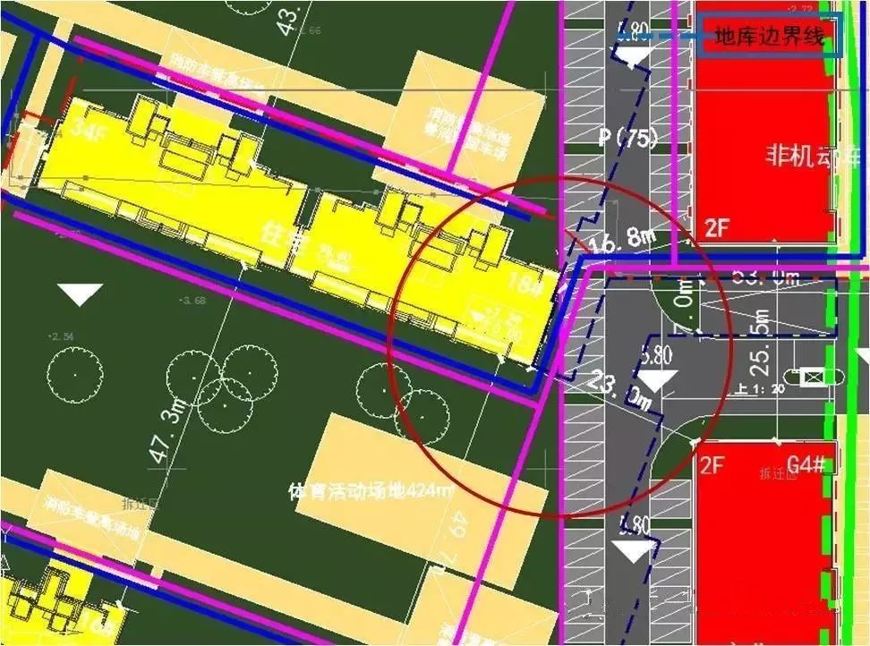 局部地庫邊界線給雨污水專業的跌水井讓出空擋,如圖。