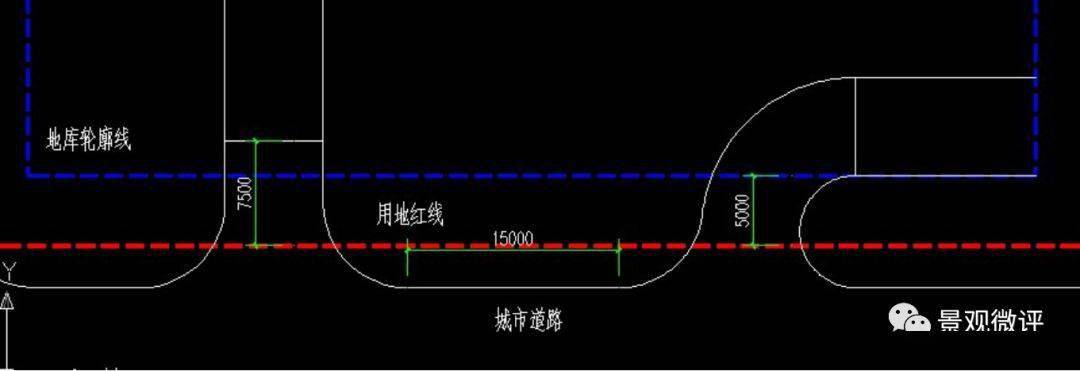 3)機(jī)動(dòng)車(chē)停車(chē)庫(kù)的出入口的坡道終點(diǎn)面向城市道路時(shí),其與城市道路紅線的距離不應(yīng)小于7.5m,平行城市道路或與城市道路斜交角度小于75度時(shí)應(yīng)后退基地的出入口不小于5.0m