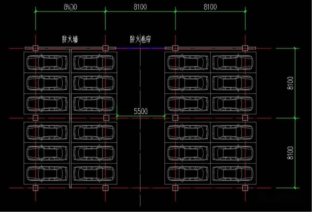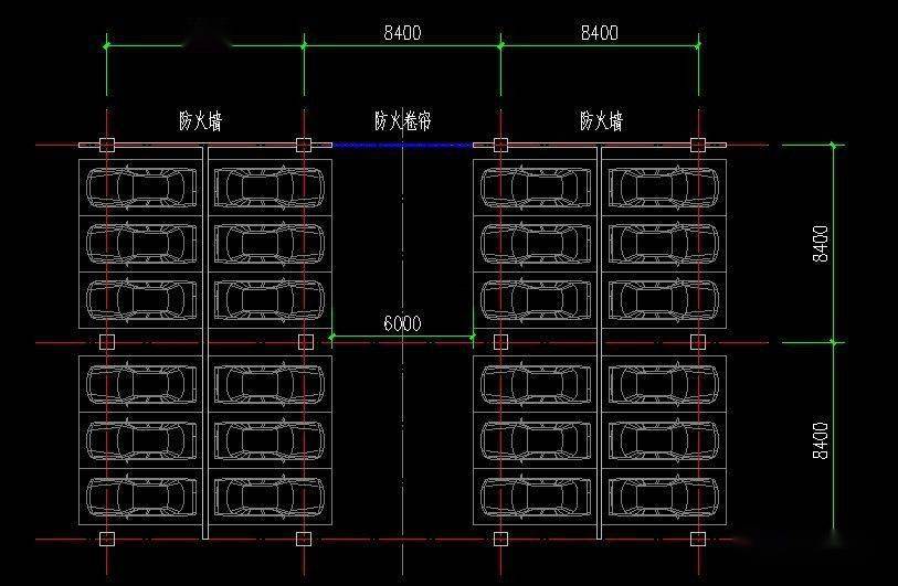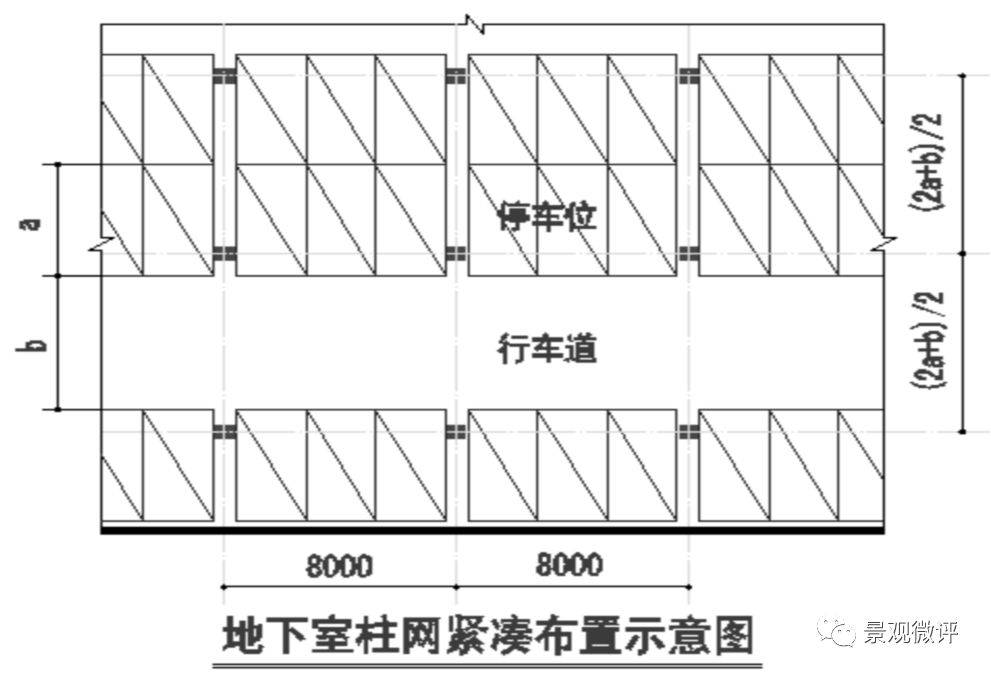 柱網(wǎng):柱網(wǎng)按7800~8400x(2a+b)/2布置。以橫向停3輛車(chē)為例,垂直行車(chē)道方向柱(2a+b)/2,其中:a為停車(chē)位深度,b為行車(chē)道寬度。