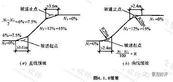 坡度超多10%時(shí),坡道上下端應(yīng)設(shè)1/2坡度的緩坡 (直線緩坡 3.6米長(zhǎng),曲線緩坡 2.4米長(zhǎng))