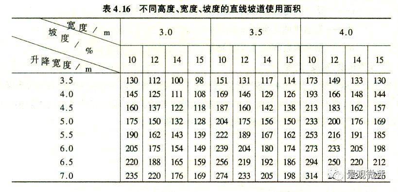 表4.14為坡道升降高度3.5~7.0 m,坡度為10%~15%條件下的直線坡道各段長(zhǎng)度。表4.16為不同長(zhǎng)度、寬度、坡度的直線坡道使用面積比較值。