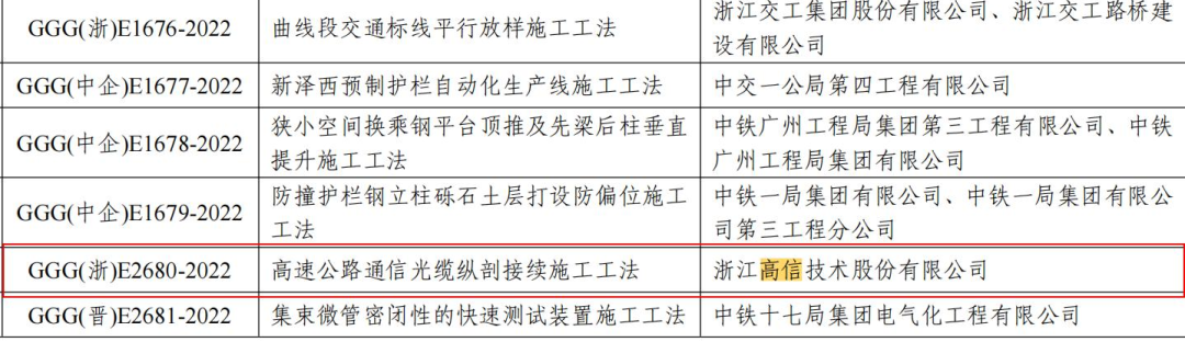 近日,中國(guó)公路建設(shè)行業(yè)協(xié)會(huì)公布了2022年度公路工程工法評(píng)審結(jié)果,浙江交通集團(tuán)高信公司申報(bào)的《高速公路通信光纜縱剖接續(xù)施工工法》、《跨海特大橋梯級(jí)式大跨距匯線電纜橋架施工工法》兩項(xiàng)工法通過(guò)評(píng)審,首次獲得部級(jí)工法的評(píng)定。