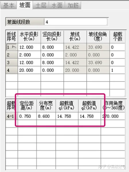 那么是不是直接勾選單列車隊或雙列車隊就可以了呢,如果單向有四個車道呢,分布四列車是不是更偏向不穩定?因此,建個簡單粗糙的模型對比一下。在理正邊坡中建了個高度16m的路堤,其余條件保持一致,只有施加的超載位置、分布寬度和強度值不同。