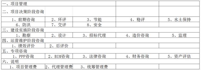 PPP項(xiàng)目主要咨詢服務(wù)內(nèi)容包括:項(xiàng)目建議書、可行性研究報(bào)告,初步實(shí)施方案、物有所值評價(jià)報(bào)告、財(cái)政承受能力論證報(bào)告、實(shí)施方案,PPP項(xiàng)目合同咨詢、項(xiàng)目招標(biāo)采購代理、中期評估、建設(shè)期或運(yùn)營期績效考核細(xì)化服務(wù)方案,建議參照項(xiàng)目投資規(guī)模進(jìn)行收費(fèi),具體如下: