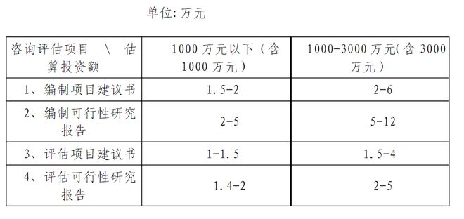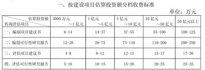 投資決策咨詢包括編制項(xiàng)目建議書、編制可行性研究報(bào)告、評估項(xiàng)目建議書、評估可行性研究報(bào)告等,取費(fèi)可參考《國家計(jì)委關(guān)于印發(fā)建設(shè)項(xiàng)目前期工作咨詢收費(fèi)暫行規(guī)定的通知》(計(jì)價(jià)格〔1999〕1283號),該文件提出了投資額在3000萬元以上的建設(shè)項(xiàng)目前期工作咨詢收費(fèi)標(biāo)準(zhǔn),而投資額3000萬元以下的建設(shè)項(xiàng)目由各省自行制定,如湖北省制定了相應(yīng)的地方標(biāo)準(zhǔn)——《省物價(jià)局關(guān)于制定估算投資額3000萬元以下建設(shè)項(xiàng)目前期工作咨詢收費(fèi)標(biāo)準(zhǔn)的通知》(鄂價(jià)房服〔2001〕107號),具體收費(fèi)標(biāo)準(zhǔn)根據(jù)估算投資額在收費(fèi)標(biāo)準(zhǔn)相對應(yīng)的區(qū)間內(nèi)用插入法計(jì)算。