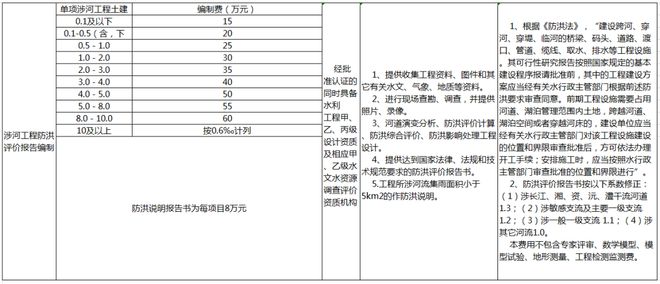 防洪評價(jià)咨詢?nèi)≠M(fèi)可參考地方收費(fèi)標(biāo)準(zhǔn),如湖南省地方標(biāo)準(zhǔn)——《湖南省物價(jià)局、湖南省水利廳關(guān)于公布水利系統(tǒng)服務(wù)性收費(fèi)項(xiàng)目和標(biāo)準(zhǔn)的通知》(湘價(jià)服〔2013〕134號),具體如下: