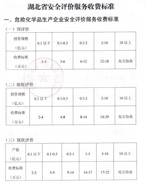 安全評價(jià)可參考地方收費(fèi)標(biāo)準(zhǔn),如湖北省地方收費(fèi)標(biāo)準(zhǔn)——《省物價(jià)局 省安全生產(chǎn)監(jiān)督管理局關(guān)于安全評價(jià)服務(wù)收費(fèi)有關(guān)問題的通知》(鄂價(jià)工服〔2016〕56號),具體如下: