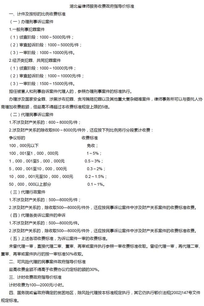 法律咨詢服務(wù)取費(fèi)可參考地方收費(fèi)標(biāo)準(zhǔn),如湖北省地方標(biāo)準(zhǔn)——《湖北省物價(jià)局、湖北省司法廳關(guān)于印發(fā)<湖北省律師服務(wù)收費(fèi)管理實(shí)施辦法(暫行)>的通知》(鄂價(jià)房服〔2006〕258號),具體如下: