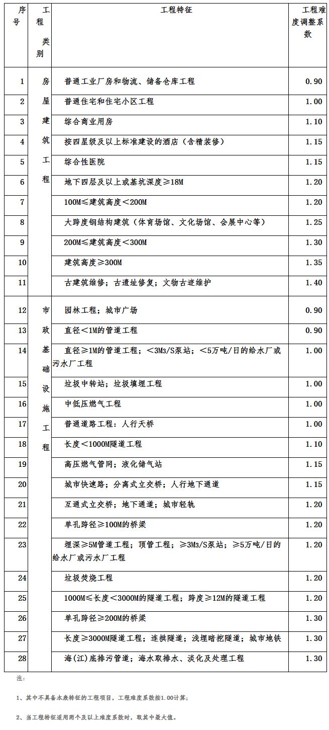 工程復(fù)雜程度分為一般、較復(fù)雜和復(fù)雜三個等級,其調(diào)整系數(shù)分別為:一般(Ⅰ級)0.85;較復(fù)雜(Ⅱ級)1.0;復(fù)雜(Ⅲ級)1.15。