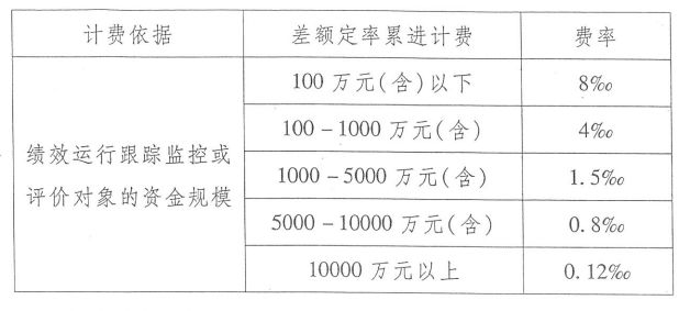 全咨單位參與預(yù)算績效管理服務(wù)取費(fèi)可參考地方收費(fèi)標(biāo)準(zhǔn),如湖北省地方標(biāo)準(zhǔn)——《湖北省財(cái)政廳關(guān)于印發(fā)<湖北省第三方機(jī)構(gòu)參與預(yù)算績效管理工作暫行辦法>的通知》(鄂財(cái)績規(guī)〔2014〕3號),績效運(yùn)行跟蹤監(jiān)控和績效評價(jià)全部委托服務(wù)采用計(jì)件收費(fèi)方式的,以績效運(yùn)行跟蹤監(jiān)控或評價(jià)對象的資金規(guī)模為計(jì)費(fèi)依據(jù)。