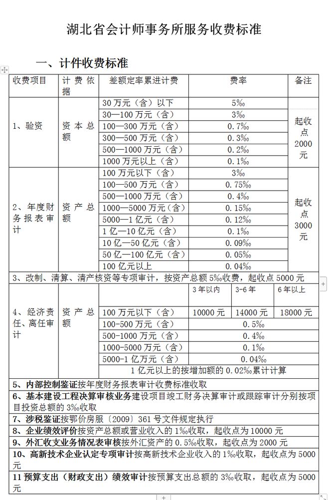 會計(jì)師事務(wù)所服務(wù)可參考地方收費(fèi)標(biāo)準(zhǔn),如湖北省地方標(biāo)準(zhǔn)——《湖北省物價(jià)局省財(cái)政廳關(guān)于印發(fā)<湖北省會計(jì)師事務(wù)所服務(wù)收費(fèi)管理實(shí)施辦法>的通知》(鄂價(jià)規(guī)〔2010〕265號),具體如下: