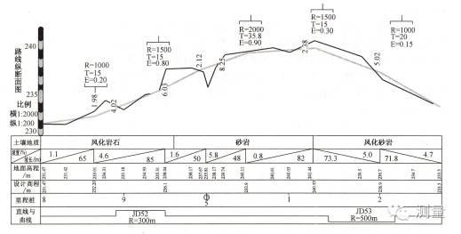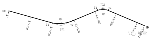 在路線平面圖中,轉折處應注寫交點代號并依次編號,如JD2 表示第2個交點。還要注出曲線段的起點ZY(直圓點)、中點Qz(曲中點)、終點YZ(圓直點)的位置。為了將路線上各段平曲線的幾何要素值表示清楚,一般還應在圖中的適當位置列出平曲線要素表。如果設置緩和曲線,則將緩和曲線與前、后段直線的切點分別標記為ZH(直緩點)和HZ(緩直點);將圓曲線與前、后段緩和曲線的切點分別標記為HY(緩圓點)和YH(圓緩點)。