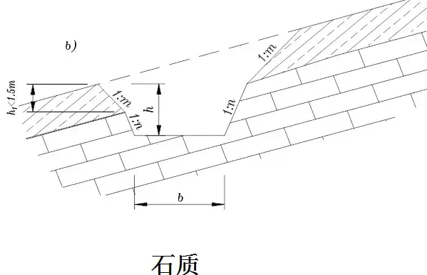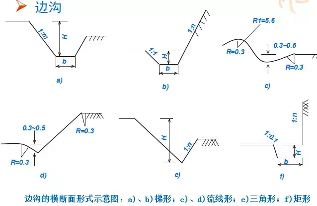 橫斷面:一般為梯形,溝的邊坡坡度,因巖土條件而定,一般采用1:1.0~1:1.5。溝底寬度b不小于0.5m,溝深h按設(shè)計流量而定,亦不應(yīng)小于0.5m。