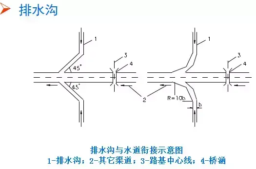 (3)排水溝水流注入其他溝渠或水道時,應(yīng)使原水道不產(chǎn)生沖刷或淤積。通常應(yīng)使排水溝與原水道兩者成銳角相交,交角不大于45?,有條件可用半徑R=10b(b為溝頂寬)的圓曲線朝下游與其它水道相接。