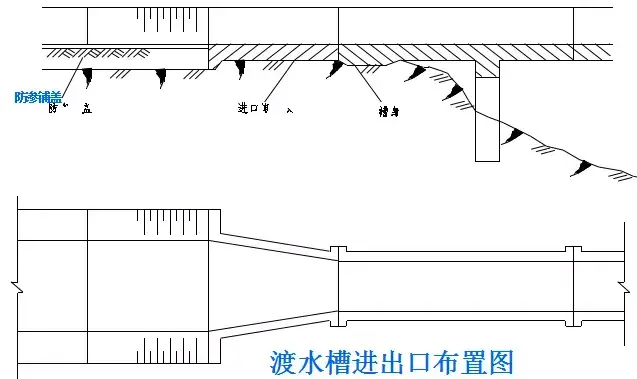 (1)設(shè)置要點:不宜過長,溝底應(yīng)具有1%~2%的縱坡,出水口底面標(biāo)高應(yīng)高出溝外最高水位20cm,以防水力倒?jié)B。