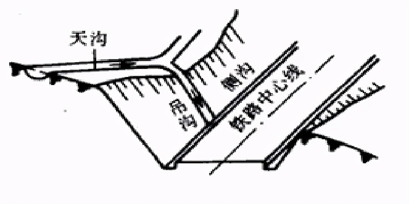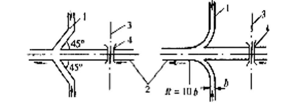 排水溝與其他溝渠相接時應力求水流舒順,因地形限制成直角相交時,可按下圖形式處置: